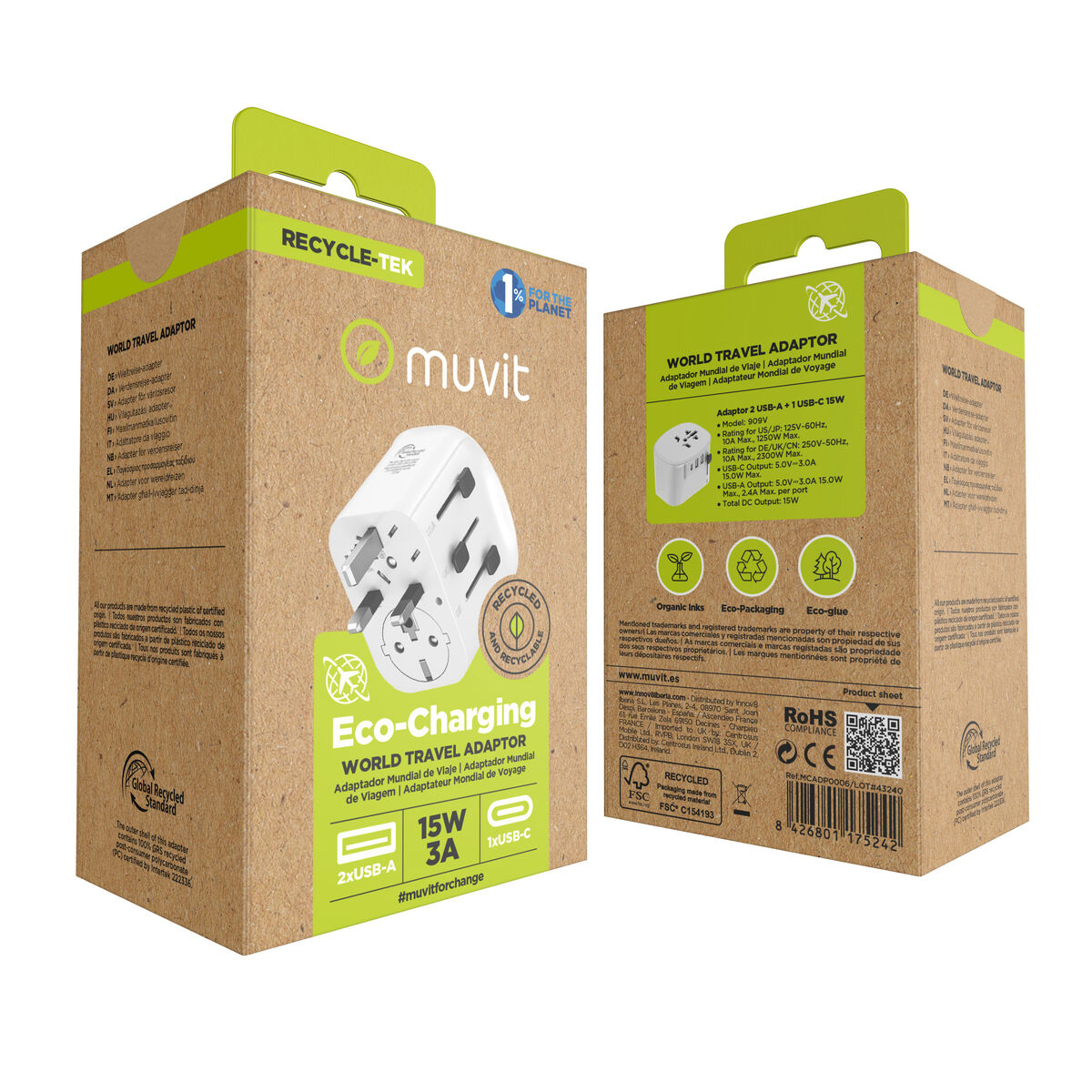 The Muvit For Change MCADP0006 universal wall charger is an accessory designed to provide a versatile and efficient charging solution for multiple devices. Featuring a sober and functional white design, this charger delivers a maximum power output of 15 W, ensuring fast and safe charging for smartphones, tablets, and other compatible devices. It includes a universal power socket that allows use with different plug types, eliminating the need for additional adapters. Additionally, it features a practical and updated port configuration with 1 USB Type-C port and 2 USB-A ports, enabling multiple devices to be charged simultaneously, optimizing charging at home or in the office. The inclusion of the USB Type-C port adds compatibility with the latest devices, offering more efficient and stable power transfer to meet current connectivity needs. Its compact size and robust design make it easy to carry and durable for daily use. This charger is a balanced option for users looking for a reliable device compatible with a wide range of devices and capable of handling standard power demands without complications. In summary, the Muvit For Change MCADP0006 combines functionality, compatibility, and a universal design to cover basic charging needs in any setting.